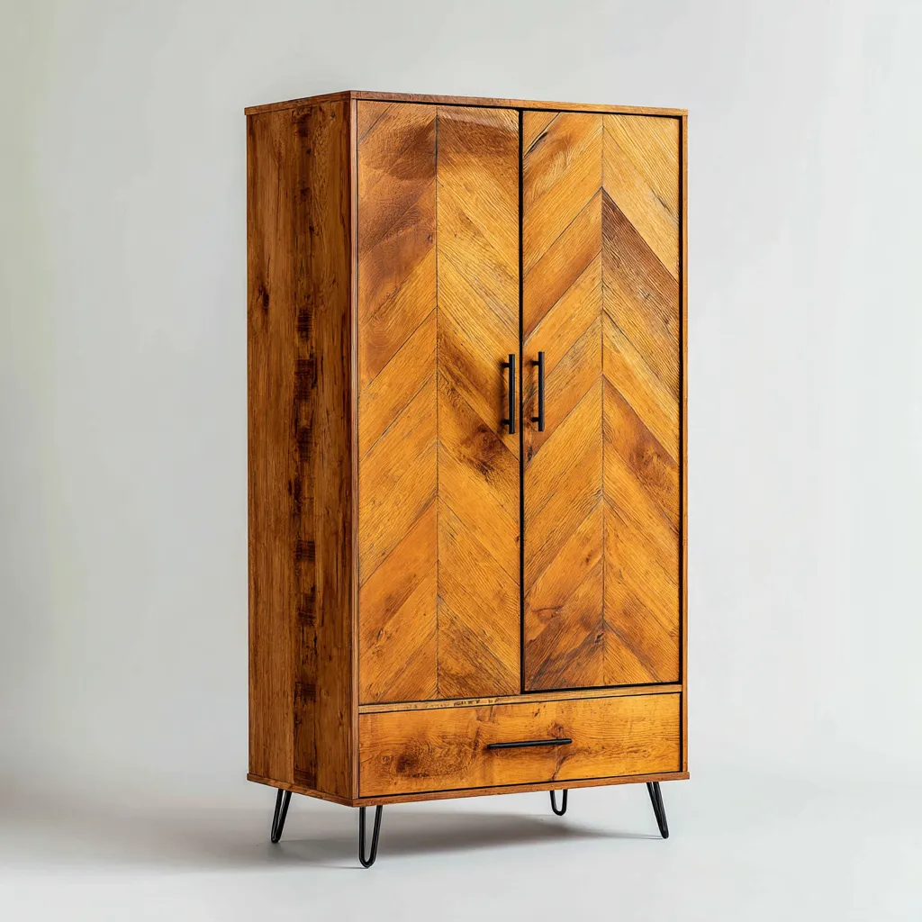 Armadio dal carattere deciso e contemporaneo progettato per l'organizzazione ordinata di abbigliamento e tessili domestici. Il motivo a spina di pesce sulle ante e la struttura slanciata lo rendono adatto a camere da letto moderne e ambienti dallo stile industriale.